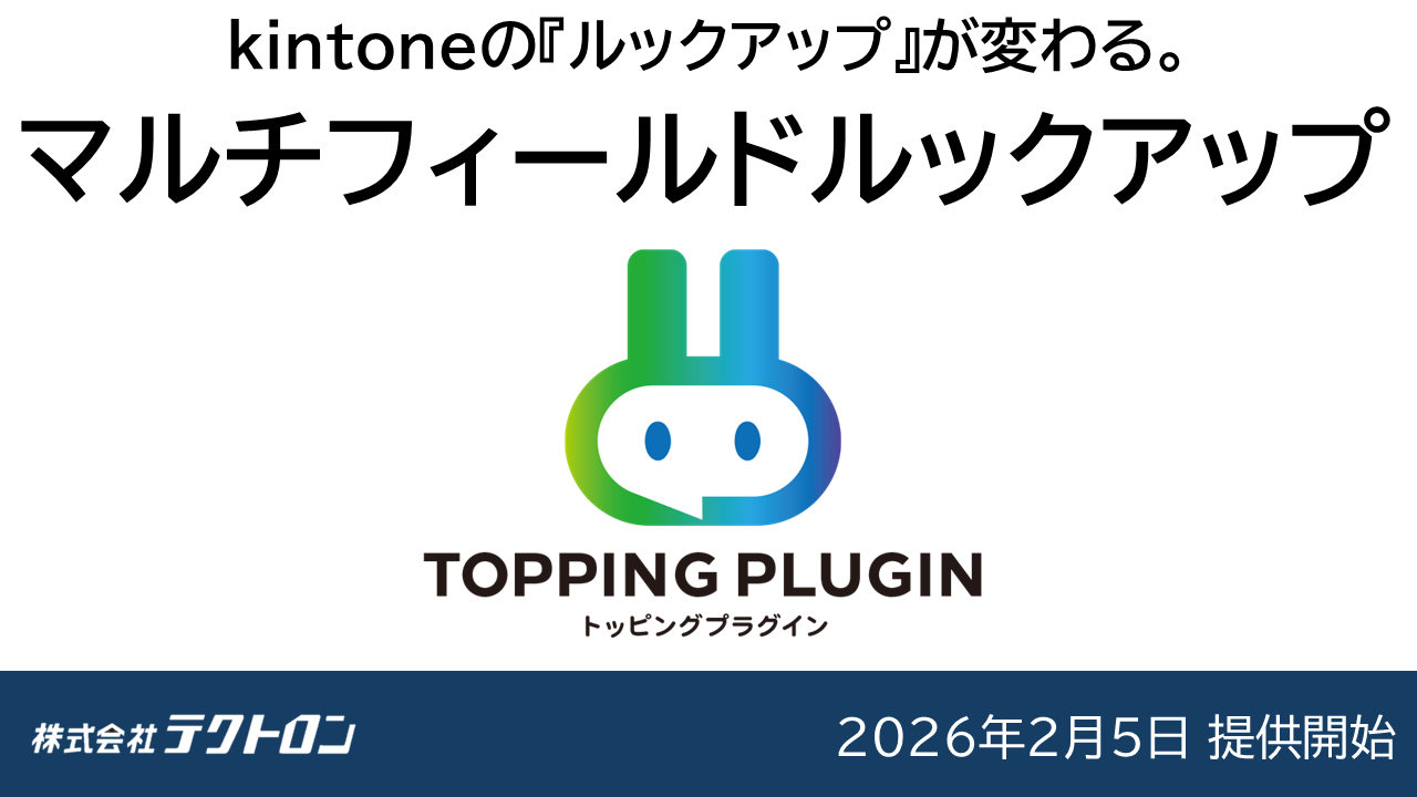 株式会社テクトロンは、サイボウズ株式会社が提供する業務改善プラットフォーム「kintone(キントーン)」の機能を拡張するプラグインシリーズ『TOPPING PLUGIN(トッピングプラグイン)』の有料版提供を、2026年2月5日より開始いたします。